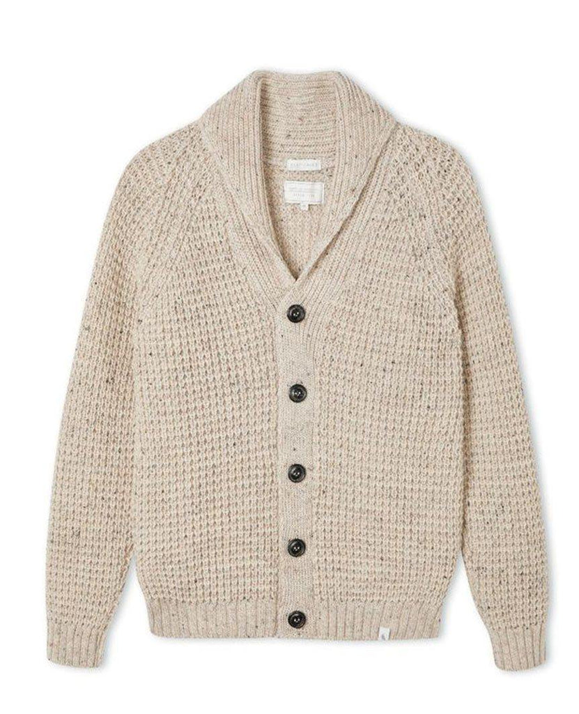 A 100% British wool waffle-knit cardigan in a chunky 5 gauge knit. This men's classic wardrobe staple features a melange (twisted) yarn of two tones creating a textured finish that adds depth and detail to the overall garment. Finished with signature button fastenings, a cosy shawl neck and raglan sleeve.